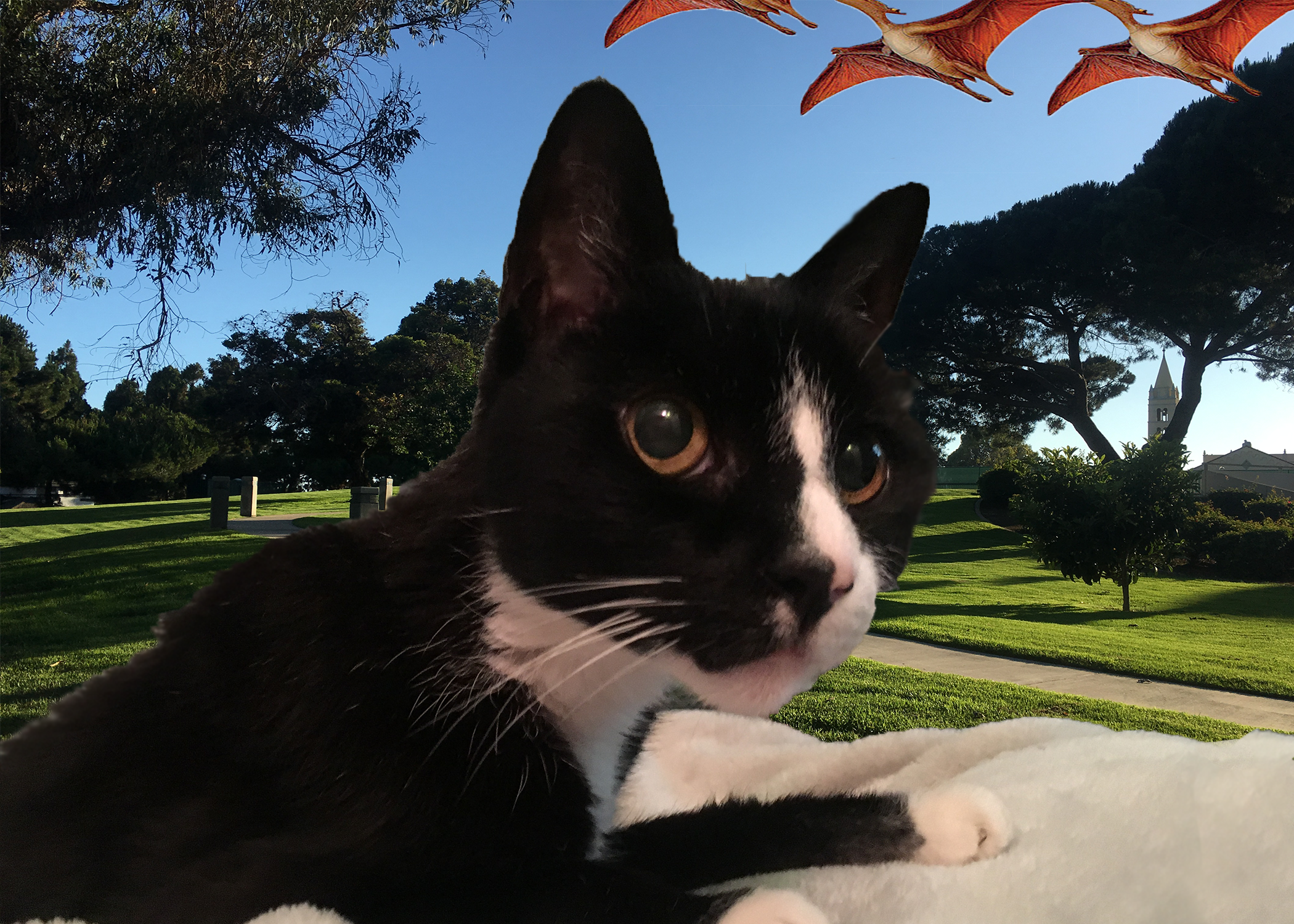 My coworker for World Wide has given me a little lesson on Photoshop which really help me with some of the basics I was lacking. Using what I was taught I used my photos and some online to create my very first “nice” photo. Here is my cat with Dinos!!